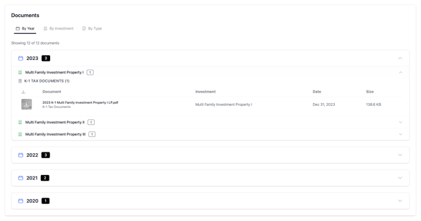 The Documents section brings every investor file into one centralized view. Documents are automatically categorized by year, by investment, or by type (for example, K-1 Tax Documents or Prospectuses).