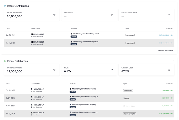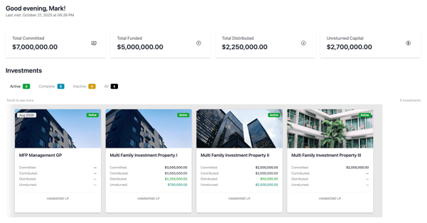 Example: An LP can log in and immediately see that $7M has been committed, $5M deployed, and $2.25M returned, across multiple real estate vehicles.