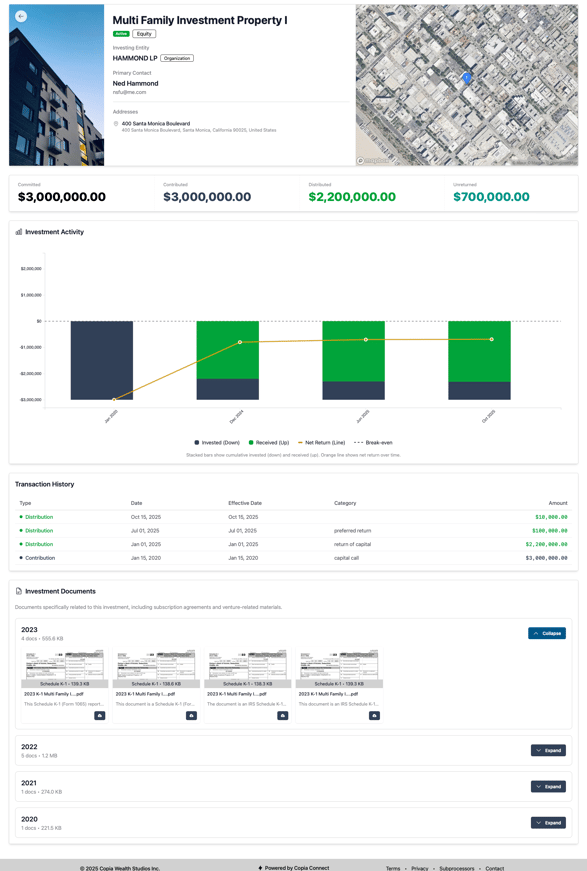 Whether it’s a single K-1 or an archived offering memorandum, every file stays tied to its related investment record—making audits and annual reviews effortless.