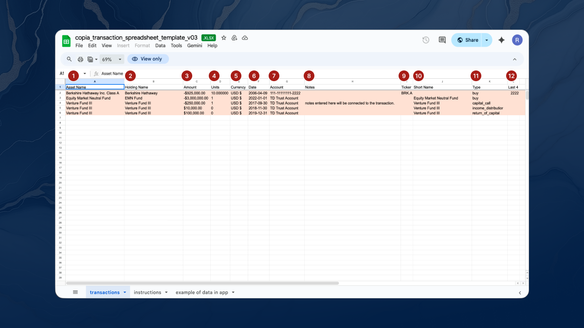 1. Account*: A name or number that uniquely represents the account. This is used for linking between accounts, holdings and transactions as part of data imports. It is very important that whatever you use here is consistent across spreadsheet uploads. This is how we connect the data together.